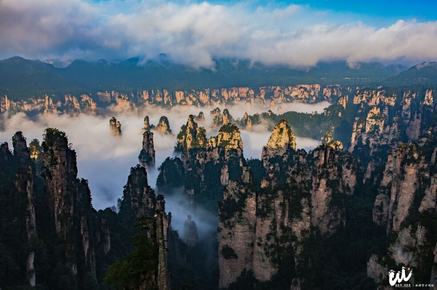 武陵源現(xiàn)初冬云海勝景2015/11/24連日降雨過后,張家界武陵源核心景區(qū)出現(xiàn)云海景觀,成片的云霧纏繞著俊俏挺拔的山峰,漫過天際,場景十分壯觀。