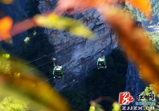 (紅葉點(diǎn)綴的張家界黃石寨索道。)