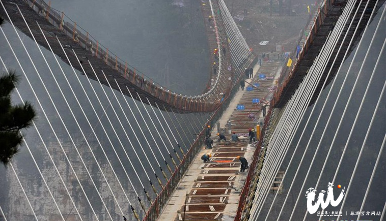張家界·武陵源旅游官網(wǎng)1月19日訊 (新華社記者 龍弘濤)近日,備受關注的張家界大峽谷人行玻璃橋正加快橋面施工進度,計劃今年上半年建成并對外開放。張家界大峽谷人行玻璃橋總長430米、寬6米,橋面距離谷底相對高度約300米。橋面全部采用透明玻璃鋪設,最大游客容量為800人。2015年12月,人行玻璃橋已成功合龍。