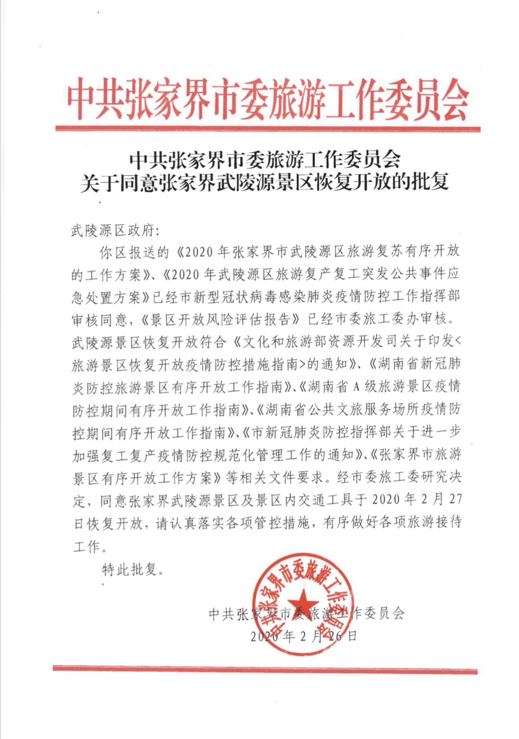 經(jīng)張家界市委、市政府研究同意,根據(jù)張家界市委旅游工作委員會(huì)2020年2月26日批復(fù),在嚴(yán)格落實(shí)疫情防控工作的前提下,張家界武陵源核心景區(qū)于2020年2月27日率先恢復(fù)對(duì)外開放。