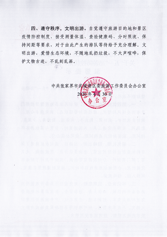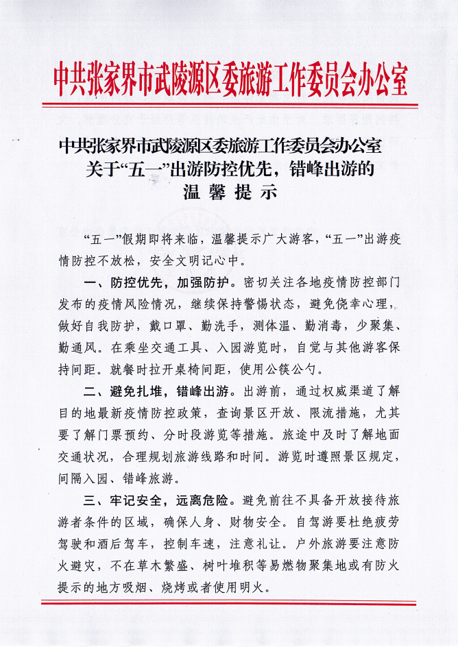 張家界武陵源景區(qū)關(guān)于“五一”出游防控優(yōu)先,錯峰出游的溫馨提示