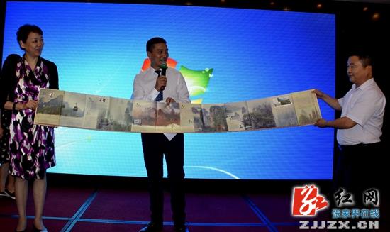 武陵源區(qū)人民政府副區(qū)長(zhǎng)萬(wàn)齊坤向上海靜安區(qū)旅游局贈(zèng)送張家界風(fēng)光紀(jì)念冊(cè)(圖片來(lái)源紅網(wǎng))
