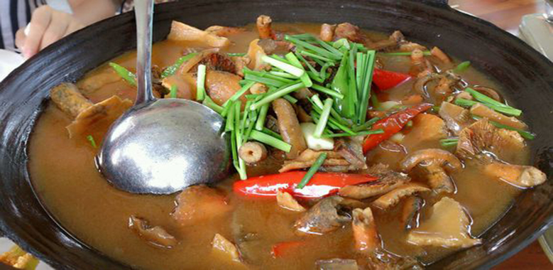 樅菌與臘肉合燉,是武陵源地區(qū)常用的做法,在小火中慢慢煨燉,臘肉的咸香與樅菌的濃香相互交融,其鮮美讓人久久無(wú)法忘卻。(口味清淡)