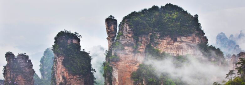 空中走廊由群仙開宴景點沿石徑蜿蜒而下約200米處,一巨峰于半腰分裂,內可行人,長300米,寬0.1-1米。南側懸崖峭壁,深不見底。北側石壁高50米,抬頭不見其頂。人行其內,如置身空中長廊。廊中虬松懸崖,亂云飛渡,山風呼嘯。廊之東、南和西南三面峰立如林,或如城墻,或加堡壘,各呈奇舉。