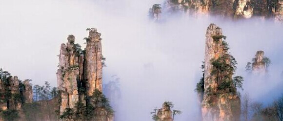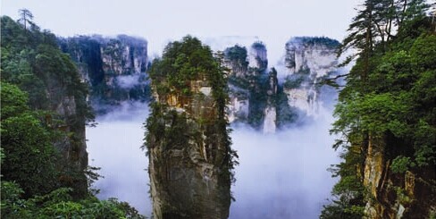 袁家界。是張家界公園又一處風(fēng)景集中地。自金鞭溪紫草潭左入杉刀溝可上袁家界;順袁家界臺(tái)地邊沿,繞荒徑小道亦可下至金鞭溪千里相會(huì)處;亦可從袁家界去天子山、楊家寨。