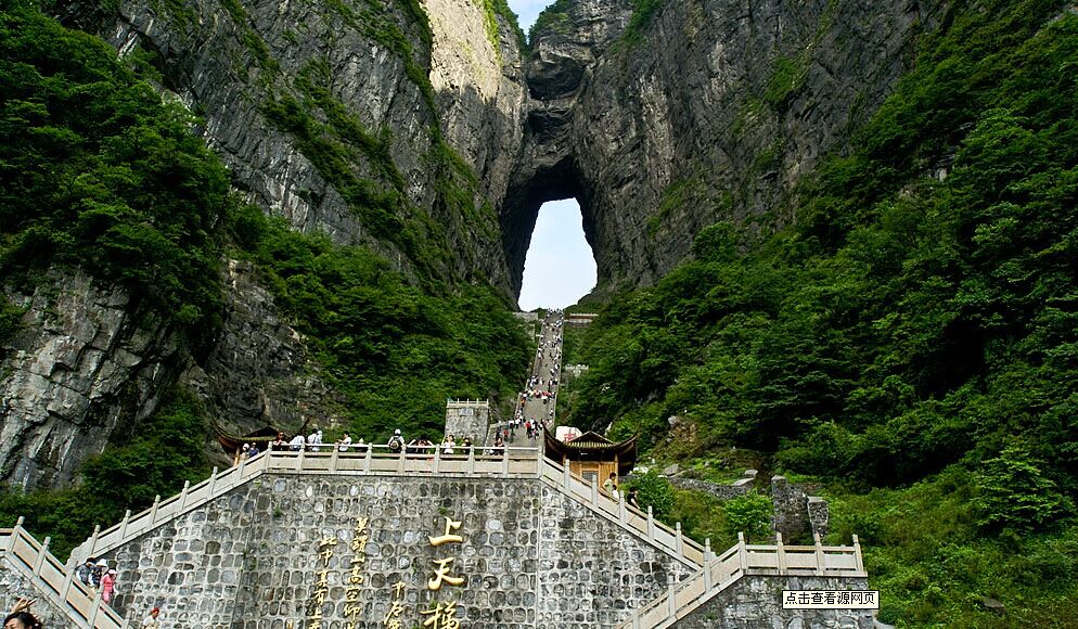 天門山古稱云夢山,又名玉屏山。坐落在張家界市區(qū)以南10公里處。公元263年,因山壁 崩塌而使山體上部洞 開一門,南北相通。三國時吳王孫休以為吉祥,賜名“天門山”。 天門洞,位于海拔1260多米的絕壁之上,門洞高131.5米,寬57米,深60余米。據(jù)地質(zhì)專家考證,門洞中央系東西巖層向 斜的交匯處,因擠壓而導(dǎo)致巖石破碎崩塌,最終于263年形成門洞。天門山海拔1517.9米,因與山下市區(qū)相對高差達1300多米,故尤顯偉岸挺拔,其天際線之美,堪為山的典型。
