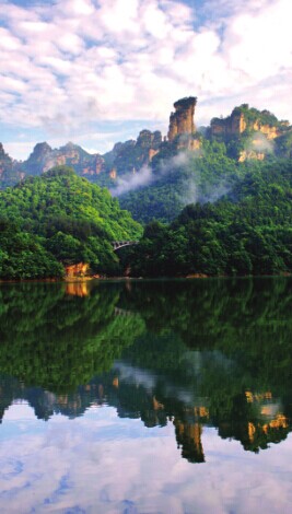 Wulingyuan peaks and valleys, springs, waterfalls, pools, lakes, river countless, waterscape type complete and drought continue to flow not dry, pleasant scenery, beautiful. Dense clouds of perennial by southeaster which, gathered on the Qi 3000, and then to the morphology of the fog rain and snow landed in between the peaks and valleys, in the form of water moistening the earth, moistens everything. Water varies, complement each other.