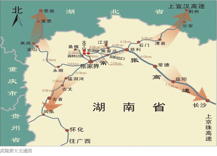 [線路一]華北及東北方向:通過京珠高速到達長沙后,經(jīng)長張高速可到達張家界市區(qū)或在陽和路口下直接到達武陵源(長張高速全程約350公里,耗時約3.5小時);