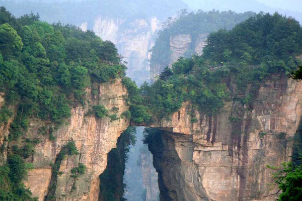 “天下第一橋”是張家界“十大絕景”之一。也是袁家界的標志性景點,它是居于兩山之間形成的一座天然石橋,而兩山原為一體,橋身是兩山相連的關鍵部分,但因中間石質較為薄弱,由于風化、崩塌作用的影響,又經(jīng)過日曬雨淋、流水洗刷、山洪沖擊,久而久之,終于形成今天這一特別的奇景。“ 天下第一橋”橋面寬兩米,厚四米,跨度為二十多米,高度為三百多米,是世界迄今為止所發(fā)現(xiàn)落差最高的天然石橋。