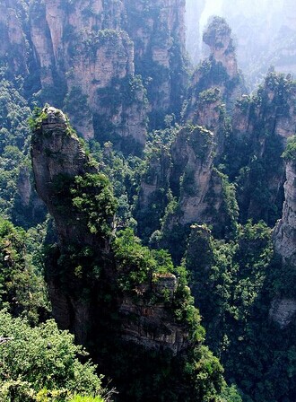 站在袁家界景區(qū)的觀景臺上,三千奇峰盡收眼底,雄險秀野,神態(tài)各異。峽谷深處,千百根石峰石柱奇?zhèn)ネ涣?。峻峭之石,如英武將帥;嵯峨之峰,似勇猛壯士。有聲有色,若靜若動,形象逼真,呼之欲出。